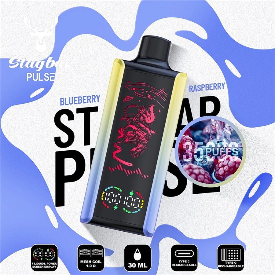 The Stag Bar Pulse 35K Puffs Disposable Vape redefines endurance with an exceptional 35,000-puff capacity from its 30ml e-liquid reservoir and robust 750mAh battery. Featuring a full LED display, a smooth 1.0Ω mesh coil, and convenient USB-C charging, it delivers lasting, consistent performance in a sleek and user-ready design.