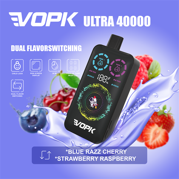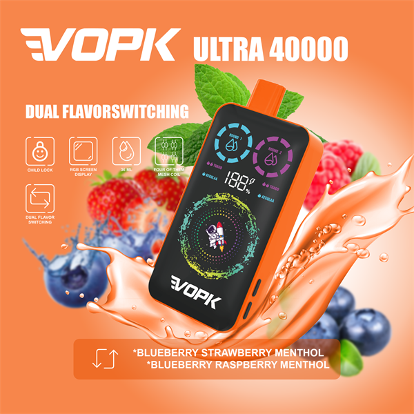 Experience the ultimate innovation with the VOPK ULTRA 40000 Puffs Disposable Vape, featuring a dual-flavor system and a large interactive screen. Enjoy extended use with its high-capacity 36ml liquid and smart child lock for enhanced safety and convenience.