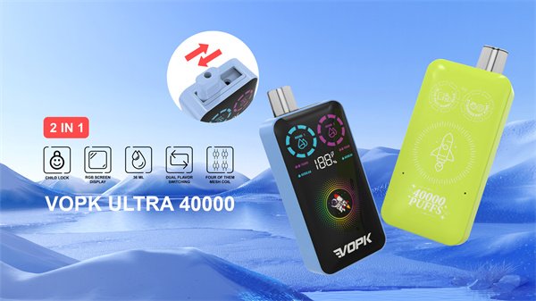 Experience the ultimate innovation with the VOPK ULTRA 40000 Puffs Disposable Vape, featuring a dual-flavor system and a large interactive screen. Enjoy extended use with its high-capacity 36ml liquid and smart child lock for enhanced safety and convenience.